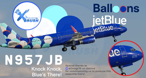 This add-on presents the ToLiss A321 JetBlue "Balloons" livery, featuring the aircraft N957JB, also known as "Knock Knock,...